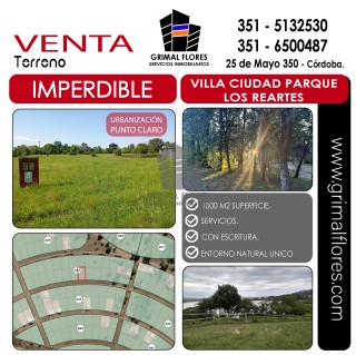 TERRENO EN URBANIZACION PUNTO CLARO - VILLA CIUDAD PARQUE LOS REARTES El terreno tiene una superficie de 1000 m2, posee escritura y posesion inmediata, con seguridad y expensas bajas, Amenities: Canchas de tenis 🎾 Canchas de fútbol ⚽ Paddle y golf ⛳ Bajada al lago y al río 🚤 Guardería náutica 🛥️ no lo dudes mas, contáctate con nosotros y vamos a visitarlo, te va a encantar