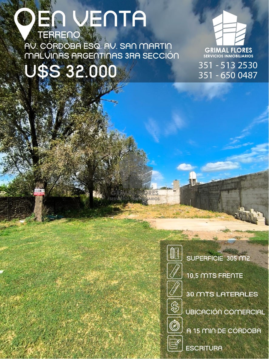 Hermoso terreno en Malvinas Argentinas 3 sección - Ubicado sobre avenida comercial ( av. Córdoba y cruce con av. San Martin ) - La zona cuenta con servicios de Agua y Luz. - Ideal para emprendimiento comercial. - Apto para construcción de vivienda o departamentos para renta.