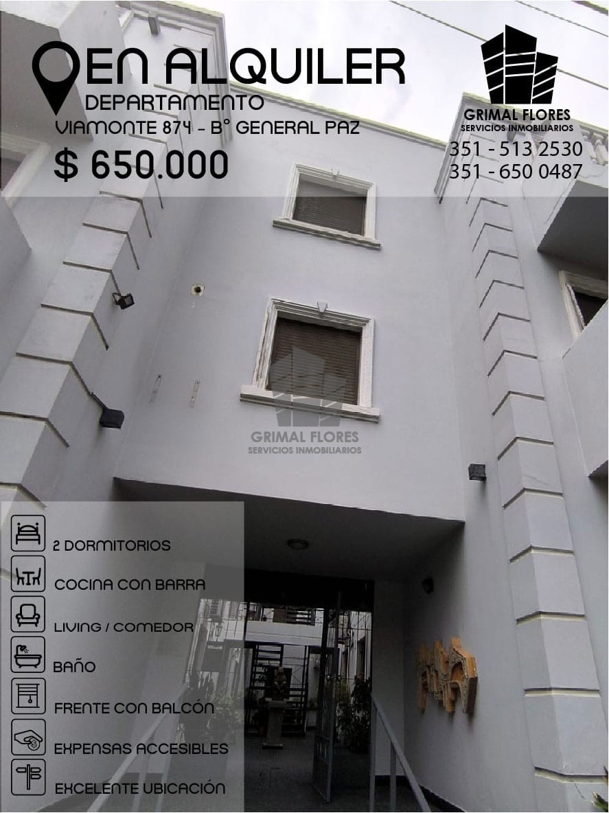 EXCELENTE OPORTUNIDAD DE VIVIR EN UNA ZONA TRANQUILA, AMBIENTE FAMILIARY A MINUTOS DL CENTRO!!! *UBICACION: VIAMONTE 784 BARRIO GENERAL PAZ. *LIVING SUPER AMPLIO Y LUM,INOSO. *BARRA DESAYUNADORA. *COCINA SEPARADA. *BAÑO. *DOS DORMITORIOS CON PLACARES EMPOTRADOS. *TERRAZA DE USO COMUN CON ASADOR. -VALOR LOCATIVO : $650.000 -INCREMENTO TRIMESTRAL POR IPC. -REQUISITOS: DEMOSTRACION DE INGRESOS POR PARTE DEL TITULAR. TRES GARANTES CON RECIBOS DE SUELDOS SUPERIORES A $1.200.000 Y 2 AÑOS DE ANTIGÜEDAD. -COSTOS: HONORARIOS INMOBILIARIOS 5 % DEL TOTAL DEL CONTRATO. CERTIFICACIÓN DE FIRMAS.