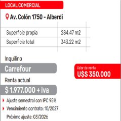 Venta de Local Comercial con renta – Excelente ubicación Se ofrece a la venta importante local comercial ubicado sobre Avenida Colón al 1750, en el consolidado barrio Alto Alberdi, una de las zonas comerciales y de alto tránsito más importantes de la ciudad de Córdoba. La propiedad cuenta con una superficie total de 343 m² y 285 m² de superficie propia, ofreciendo amplios espacios ideales para actividad comercial y gran visibilidad sobre una de las arterias principales de la ciudad. Actualmente el inmueble se encuentra alquilado por la firma Carrefour, con contrato vigente hasta octubre de 2027, lo que lo convierte en una excelente oportunidad de inversión con renta asegurada. Características destacadas: Superficie total: 343 m² Superficie propia: 285 m² Ubicación estratégica sobre Avenida Colón Zona de alto tránsito vehicular y peatonal Contrato de alquiler vigente hasta octubre de 2027 Renta actual: $1.977.000 + IVA Actualización: ajuste semestral por IPC (95%) Ideal para inversores que buscan un activo comercial consolidado, con inquilino de primera línea y flujo de ingresos inmediato.